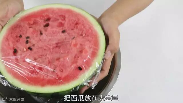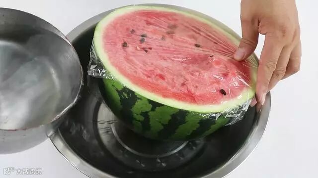 包上保鲜膜的目的是,不让昆虫或者是脏东西落在我们西瓜上,破坏我们西瓜的营养,这样我们把保鲜膜包一下,包好之后我们准备一个大盆儿,