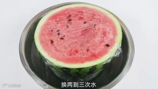 让清水放到西瓜皮的3/4处是最多的地方,如果你放清水放的太多清水会渗入到西瓜里边,这样照样破坏西瓜的口感,咱们只需这样存放西瓜可以让西瓜保持24个小时之后跟我们刚切的是一个味道,原汁原味,但是还有一点必须要注意的,咱们保存24个小时时要给西瓜换一下水,换两到三次水。