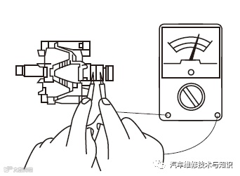 ② 将万用表拨至直流电压挡(50VDC),红表笔接至发电机电枢“+”接线柱,黑表笔搭铁;