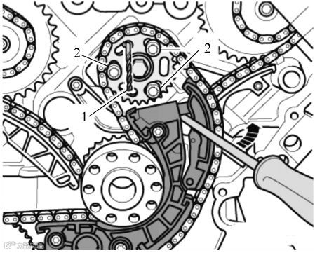 (7)用旋具按压链条张紧器臂(箭头)并同时拧紧链轮螺栓2。