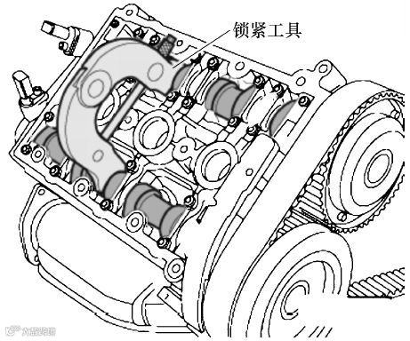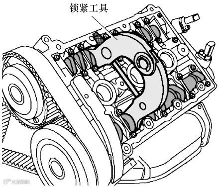 (8)如下图所示,将锁紧工具装到右侧气缸盖凸轮轴上以固定凸轮轴,来回略微转动曲轴,使锁紧工具的卡槽可以正确卡到凸轮轴上 ▼