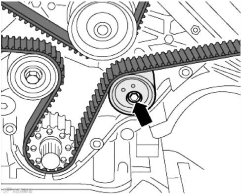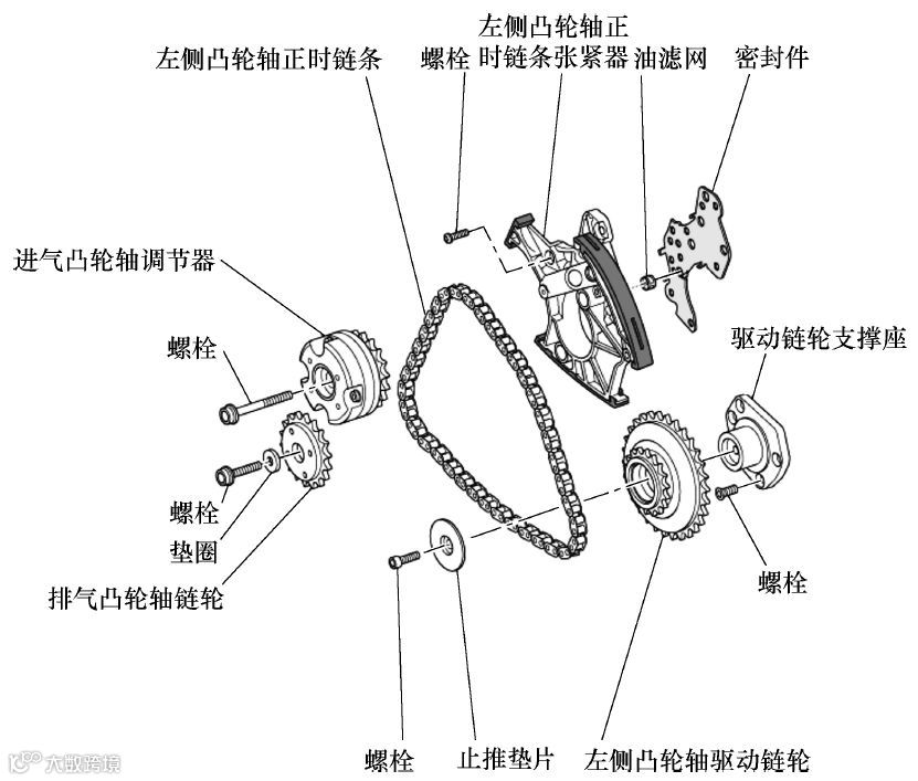 (9)旋出链条张紧器固定螺栓并取下链条张紧器,然后取下凸轮轴正时链条。