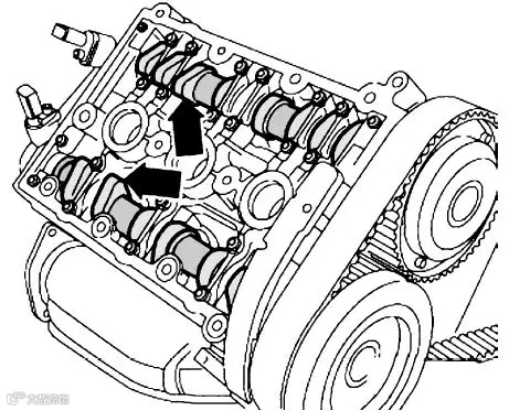 (7)转动发动机,直至3缸(右侧气缸列)进气和排气凸轮轴上的凸轮(箭头)均指向上方 ▼