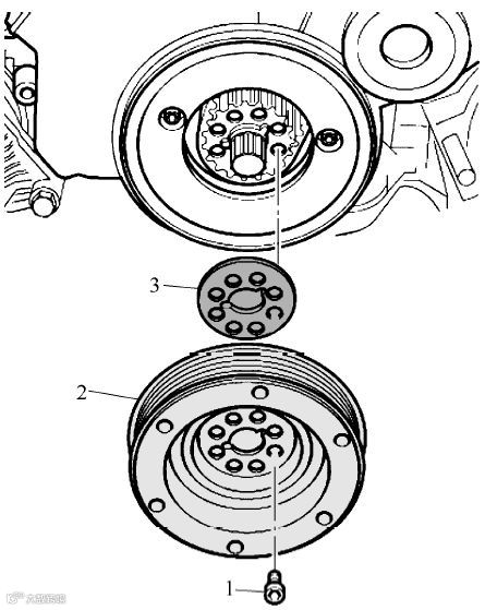 (5)旋出8个螺栓1,取下减振器2和止推垫片3 ▼
