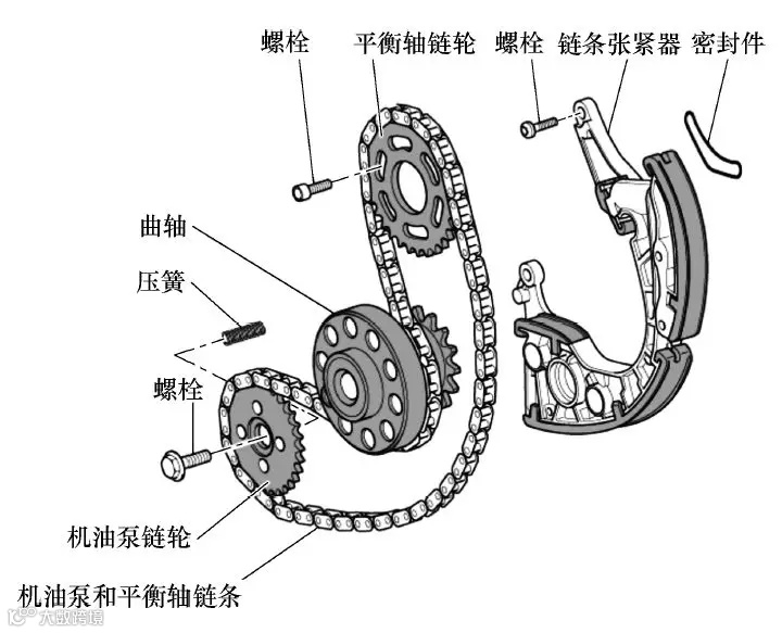 (2)安装链条张紧器及链条和平衡轴链轮。
