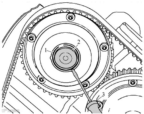 (12)将所有凸轮轴齿形带轮上盖罩2的卡环1用旋具3撬出 ▼
