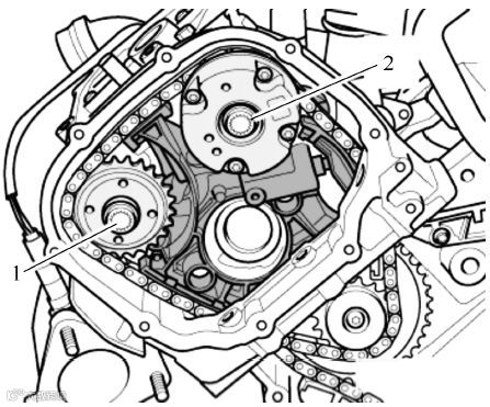 (8)旋出凸轮轴调节器和凸轮轴链轮的螺栓1和2,取下凸轮轴调节器和凸轮轴链轮 ▼