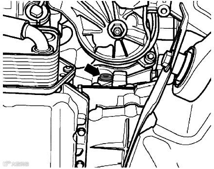 (11)拧下气缸体上止点标记的密封塞,必要时略微来回转动曲轴,把锁止工具拧入并拧紧 ▼