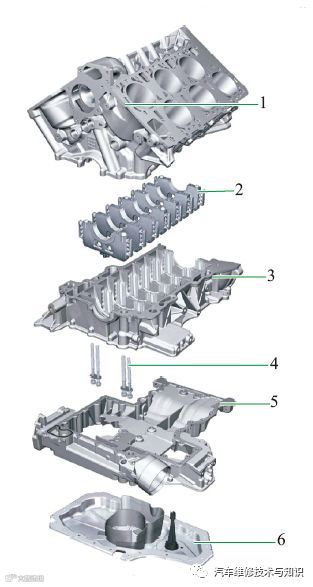 1—气缸体;2—曲轴轴瓦盖;3—曲轴箱;4—曲轴箱紧固螺栓;5—曲轴箱下盖;6—油底壳