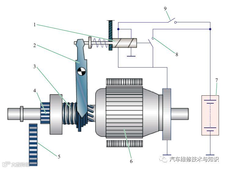 1—铁芯;2—驱动杠杆;3—弹簧;4—齿轮;5—飞轮;6—起动机;7—蓄电池;8—短路开关;9—启动开关