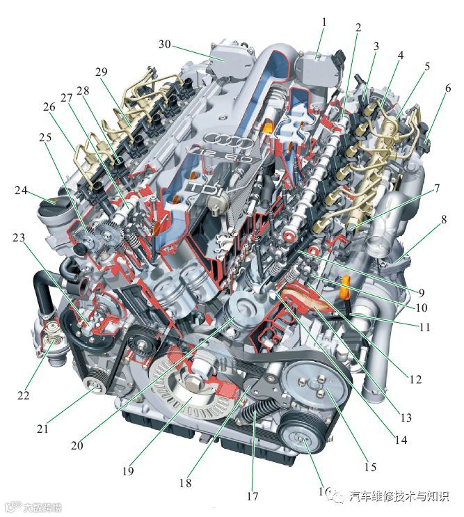 1—节气门(右侧气缸);2—凸轮轴(右侧气缸);3—高压喷油器插接器(右侧气缸);4—高压输油管(右侧气缸高压轨至喷油器);5—燃油高压轨(右侧气缸);6—燃油高压泵(左侧气缸);7—燃油压力传感器;8—涡轮增压器;9—高压喷油器;10—摇臂;11—机油尺;12—液压挺柱;13—排气歧管;14—气门;15—转向助力泵;16—空调压缩机;17—皮带轮张紧器弹簧;18—皮带轮张紧器;19—曲轴皮带轮;20—活塞;21—发电机;22—节温器;23—冷却液泵;24—机油加注口;25—凸轮轴啮合齿轮;26—高压输油管(左侧气缸高压轨至喷油器);27—凸轮轴(左侧气缸);28—高压喷油器插接器(左侧气缸);29—燃油高压轨(左侧气缸);30—节气门体(左侧气缸)