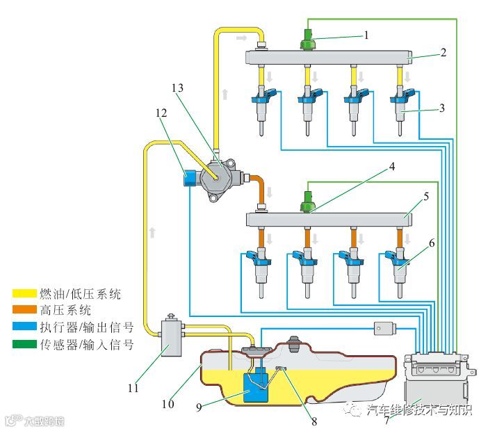 1—低压燃油压力传感器;2—低压燃油油轨;3—低压喷油器;4—燃油压力传感器;5—高压燃油油轨;6—高压喷油器;7—燃油泵控制单元;8—燃油量传感器;9—燃油系统增压泵;10—燃油箱;11—燃油滤清器;12—燃油压力调节器;13—高压燃油泵