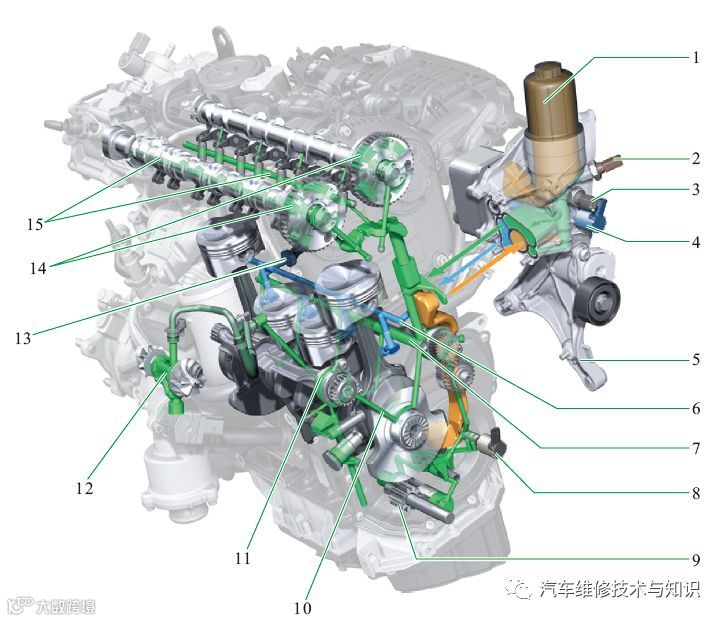 1—机油滤清器;2—用于降低油压的机油压力开关;3—机油压力开关;4—活塞冷却喷嘴控制阀;5—辅助装置托架;6—活塞冷却油道;7—曲轴轴颈润滑油道;8—机油压力控制阀;9—两段式(可调式)外部齿轮机油泵;10—曲轴轴颈润滑;11—平衡轴轴颈润滑;12—涡轮增压器润滑/冷却;13—机油压力开关(凸轮轴执行器);14—凸轮轴正时齿轮润滑/调节;15—凸轮轴润滑