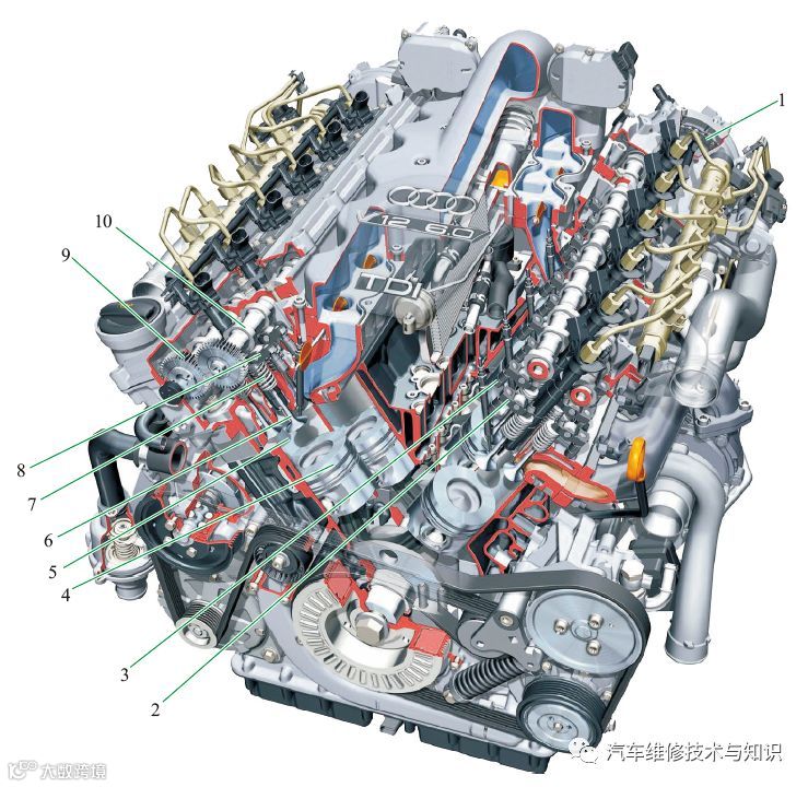 1—进气压力/温度传感器;2—燃油高压泵;3—空气滤清器;4—TDI喷油器;5—凸轮轴;6—燃油输送管至高压轨;7—高压油轨压力传感器;8—凸轮轴驱动链;9—凸轮轴链轮;10—转向助力泵;11—空调压缩机;12—驱动皮带;13—驱动链条轨;14—曲轴皮带轮;15—活塞;16—气门;17—气门弹簧;18—摇臂;19—液压挺柱;20—机油加注口;21—高压油轨;22—发动机罩盖