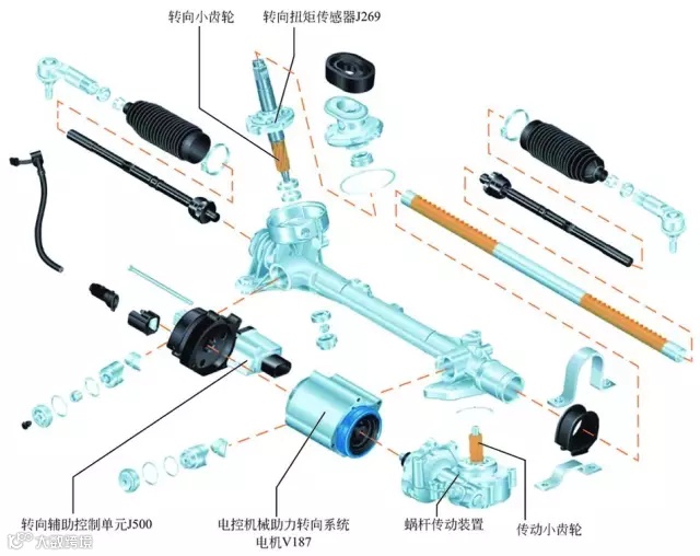 转向器由转向扭矩传感器、扭转杆、转向小齿轮、传动小齿轮、蜗杆传动装置以及带控制单元的电机构成。