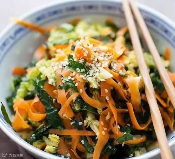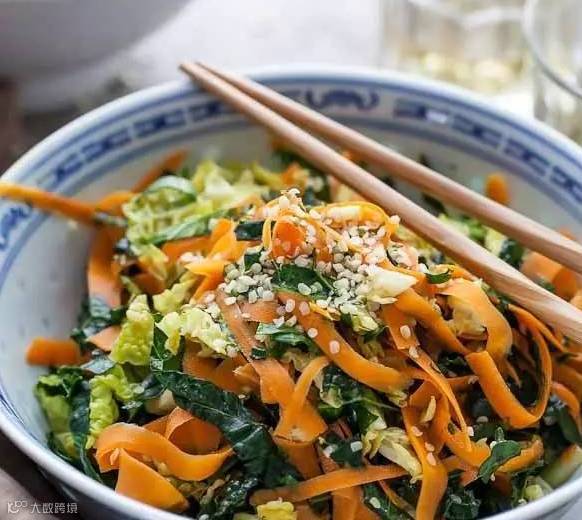 ▷做法: 将包菜去皮切丝,胡萝卜擦成丝,然后在一个小碗中倒入橄榄油、芝麻油、醋、糖浆、酱油,放入全部蔬菜腌制10分钟后,加盐和胡椒粉即可食用了。想要菜品更加温和的话,可以上锅蒸3-5分钟。