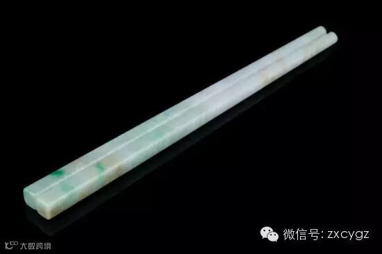 这对翡翠筷子也很有特色,也是一般的质地,但是颜色非常的丰富,兼具白、翠、翡色,细看还有淡淡的紫罗兰色,颜色搭配的很漂亮,这对筷子虽然造型简单,加工起来并不容易。筷子又细又长,切料时稍不注意,就可能切歪,变成废料。它要求料要够长,够直,质地要干净,颜色要漂亮,才能做出这么一对完美的筷子,很是难得。