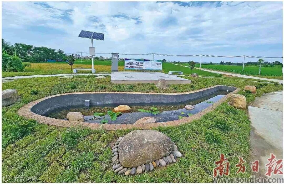 农村生活污水治理与农村环境卫生治理紧密相连,共同构成了农村生态环境治理的“一体两面”。在郑屋村,除了地埋式垃圾收集示范点,还同步新增了另一个小景点,污水处理站。底下是污水处理系统,地面上则设置成了一个小池塘,鱼儿在水中欢快嬉戏。
