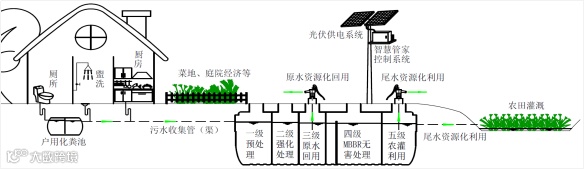 本项目采用农村污水资源化利用与零电费“两微”智能处理协同治理模式,工艺流程包括大三格化粪池、固定床生物膜(FBBR)工艺段和尾水利用池等。