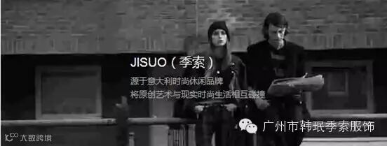 广州韩珉服装有限公司,一个源于意大利时尚休闲品牌(季索)JISUO,将原创艺术与现实时尚生活相互碰撞。