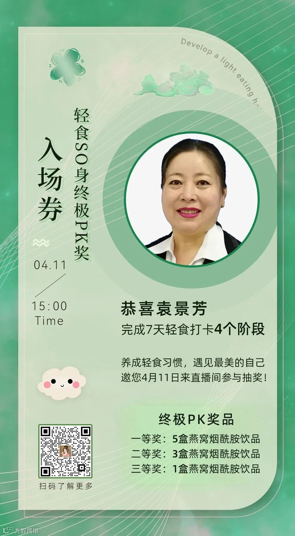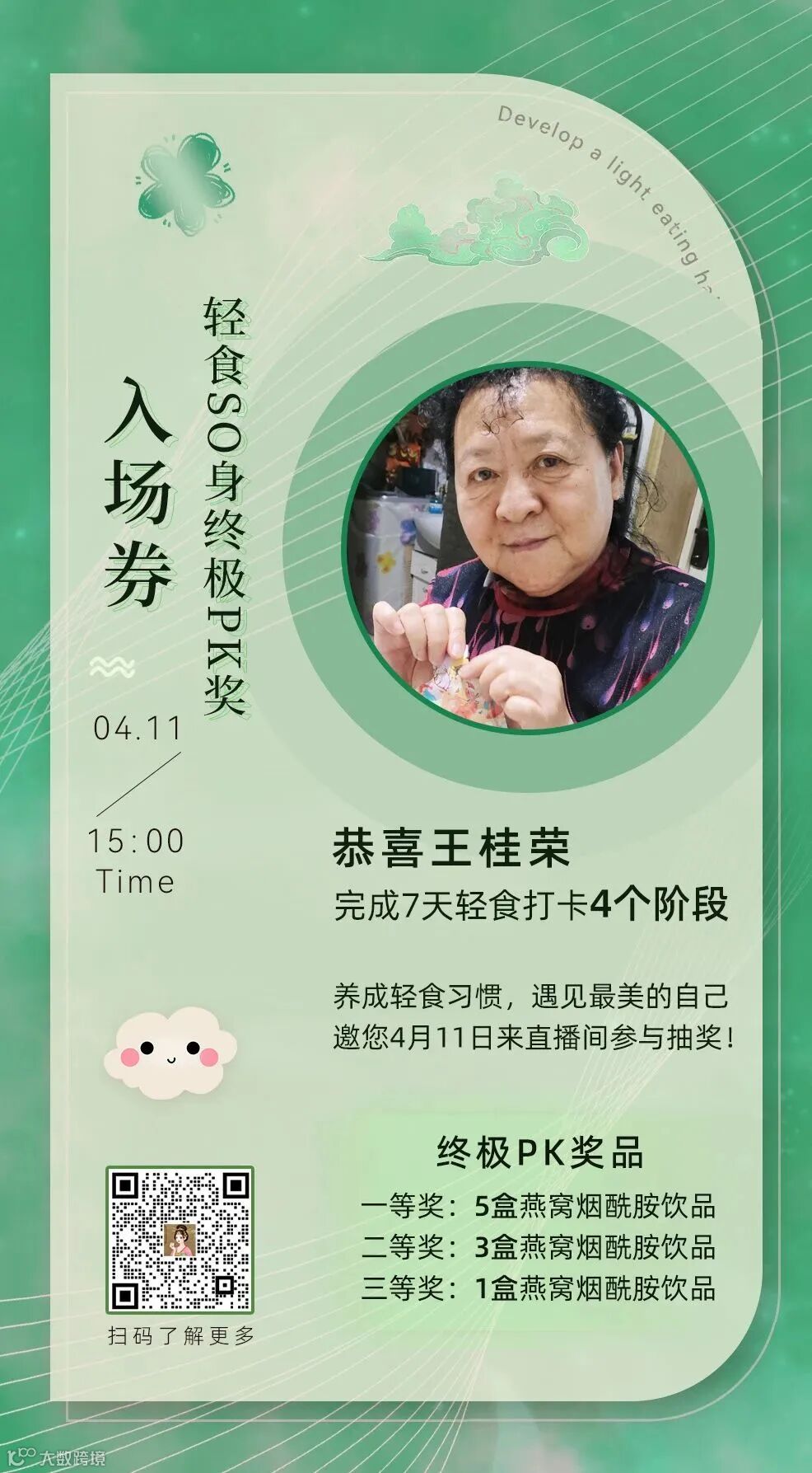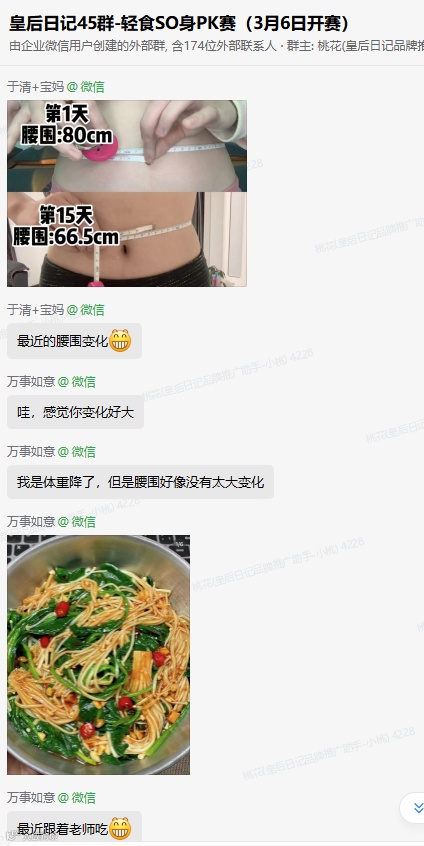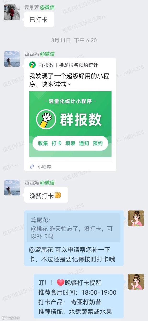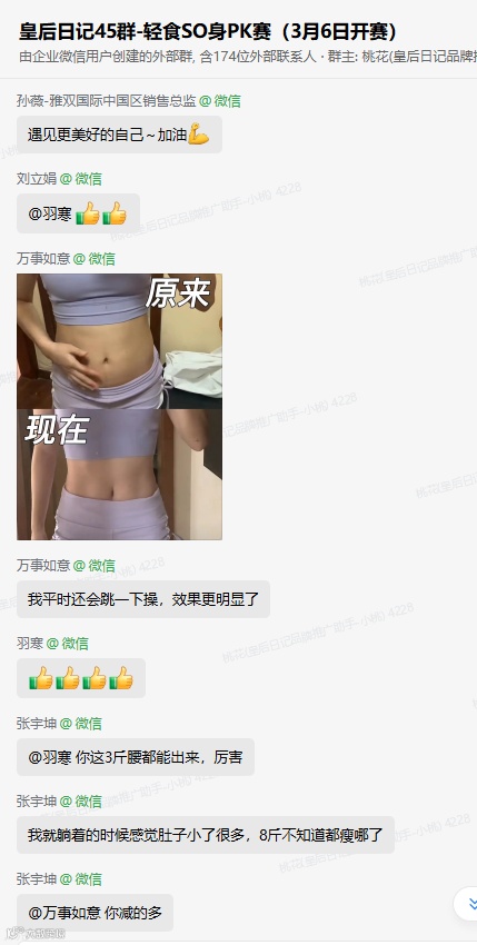 报名成功后各位家人们需要根据轻食7天套盒的食用方式,在群内进行每日打卡。坚持打卡一个月,即可入围终极PK赛,获得抽奖资格。截止到4月10日,进入到第一轮终极PK赛的意志强大的美人儿们有428人。