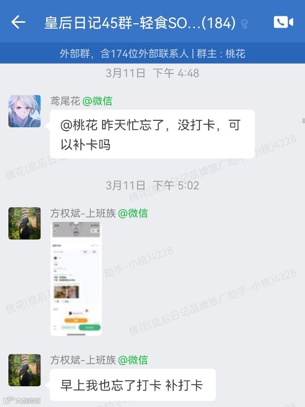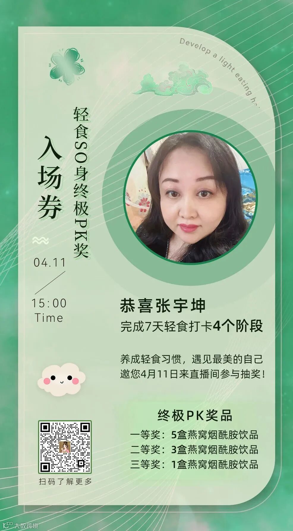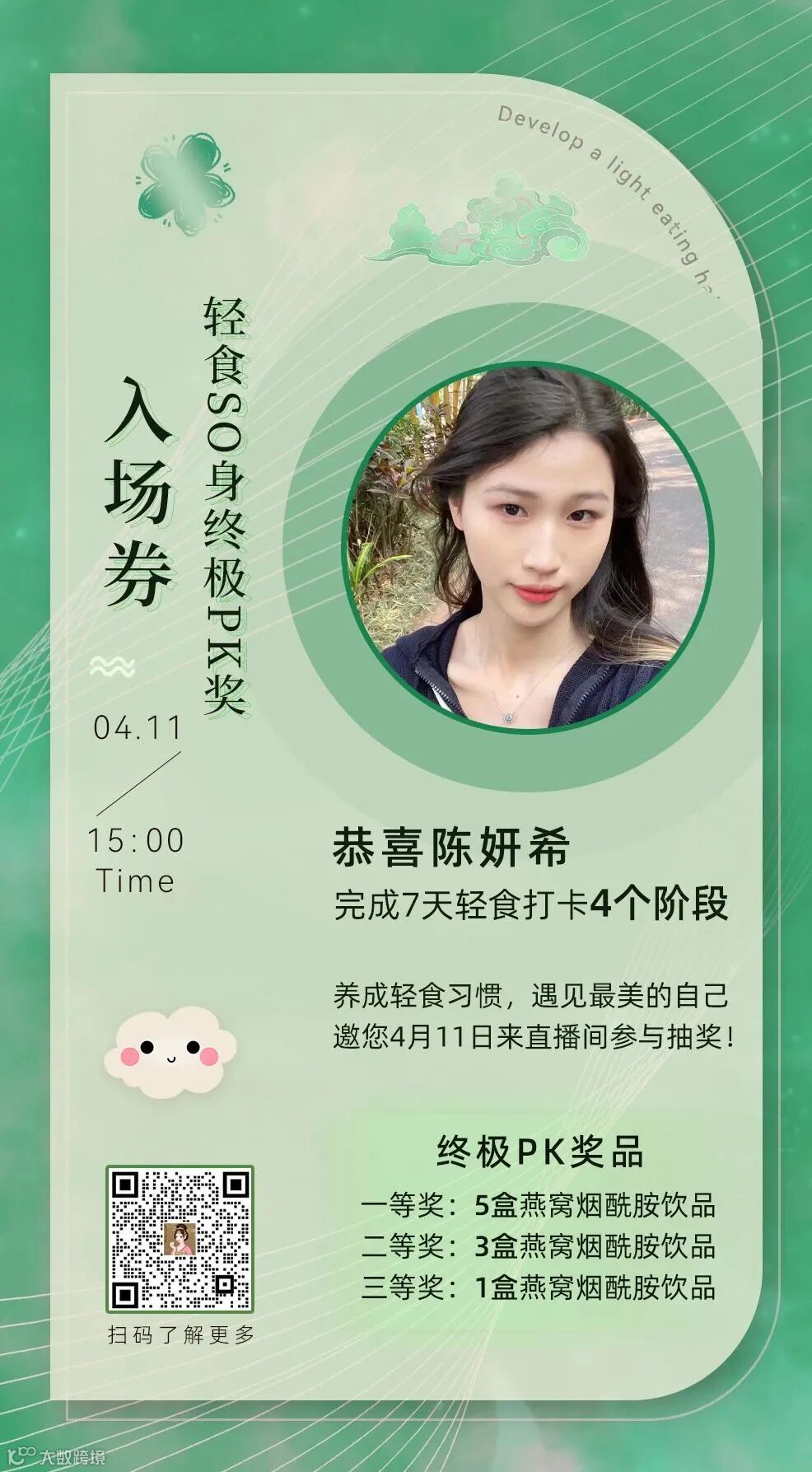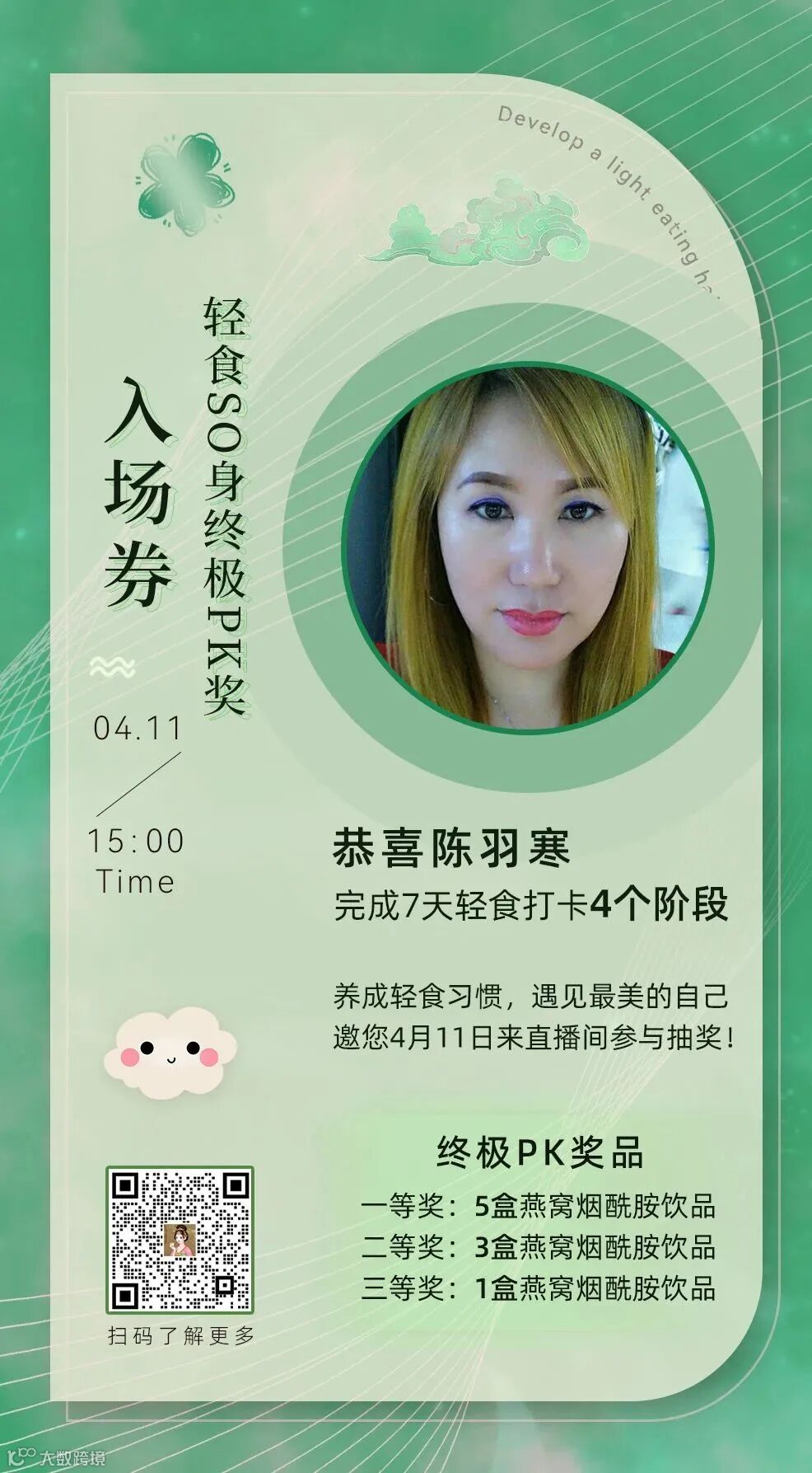 报名成功后各位家人们需要根据轻食7天套盒的食用方式,在群内进行每日打卡。坚持打卡一个月,即可入围终极PK赛,获得抽奖资格。截止到4月10日,进入到第一轮终极PK赛的意志强大的美人儿们有428人。
