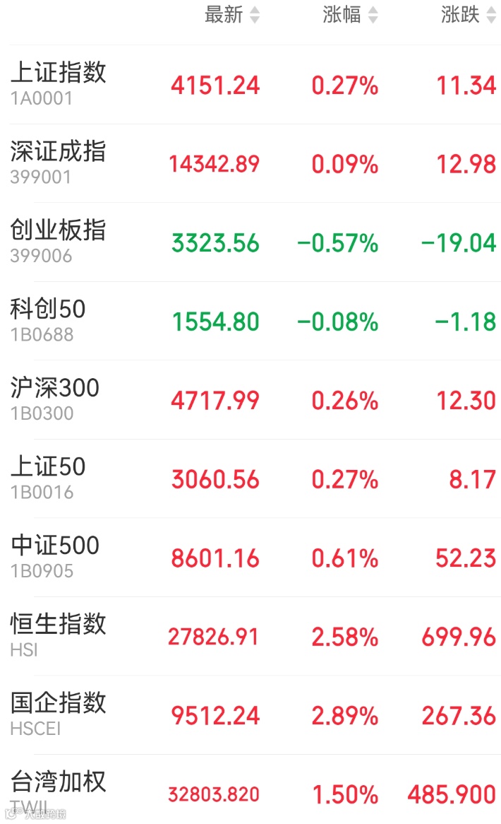 1、A股:A股震荡整理,资源股全线爆发,光伏产业链调整。截至收盘,上证指数上涨0.27%报4151.24点,深证成指涨0.09%,创业板指跌0.57%,北证50跌0.16%,万得全A涨0.11%。市场成交额升至2.99万亿元。多只宽基ETF尾盘成交放量,沪深300ETF华泰柏瑞成交额超400亿元,沪深300ETF易方达超300亿元。