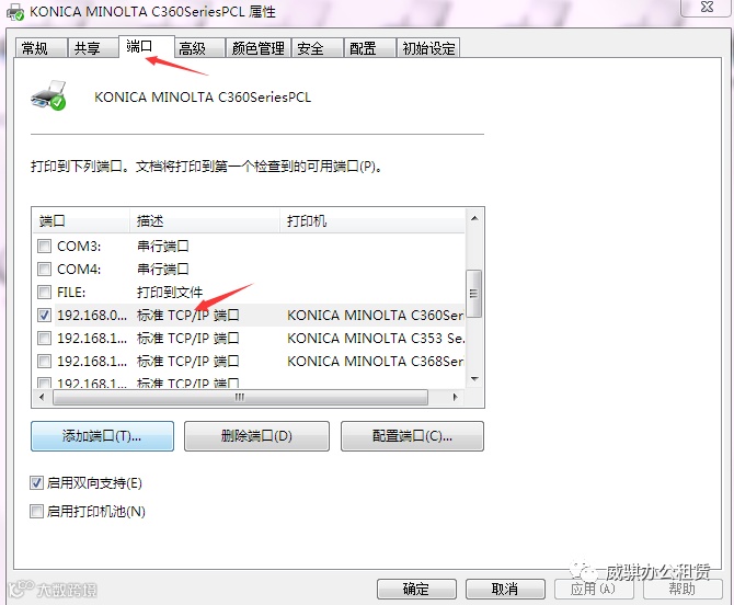 ,一般打印一张配置页面,里面有打印机的信息。(或者电脑上wiondows开始键-设置 打印机和传真- 选择正在使用的打印机-右键–打印机属性-端口)