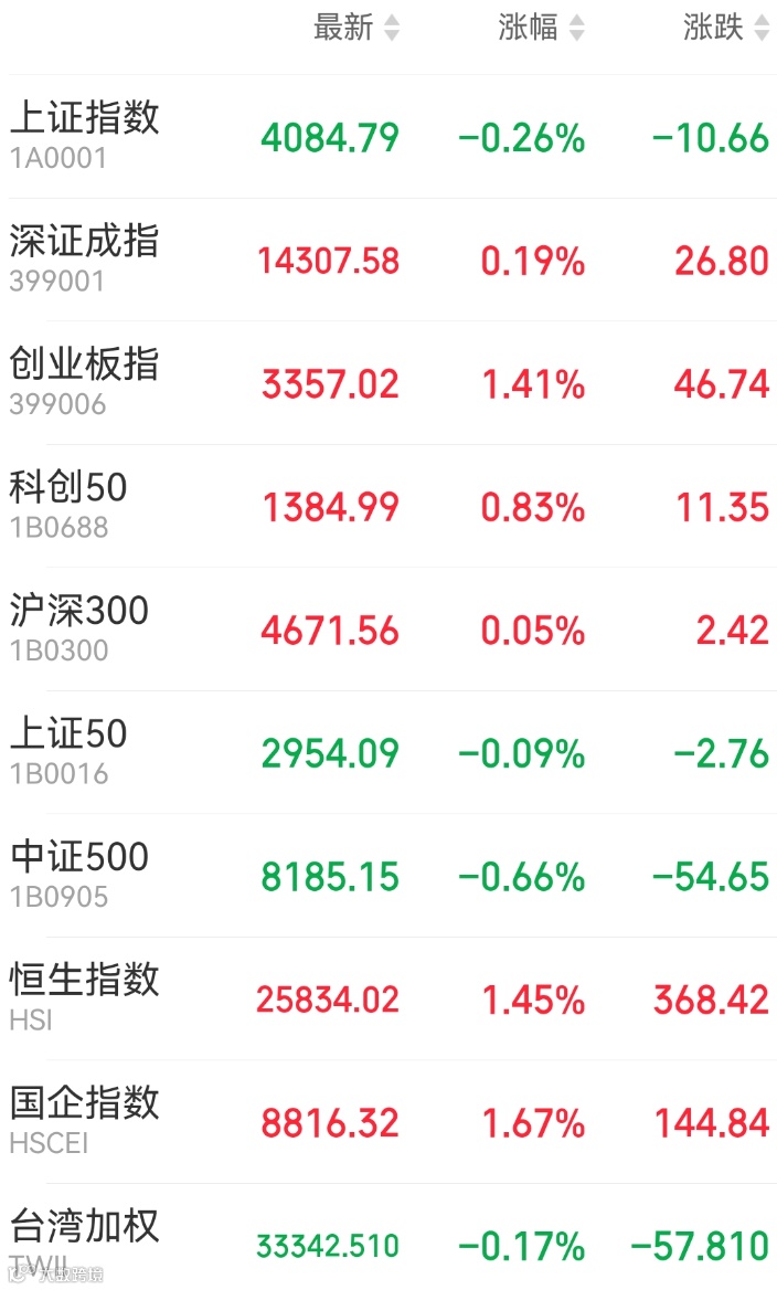 1、A股:A股探底回升,上证指数跌0.26%报4084.79点,深证成指涨0.19%,创业板指涨1.41%,万得全A跌0.05%,市场成交额2.34万亿元。存储芯片、先进封装、HBM概念爆发,海运、白酒、汽车板块表现亮眼;有色金属、石油化工、大基建板块低迷。