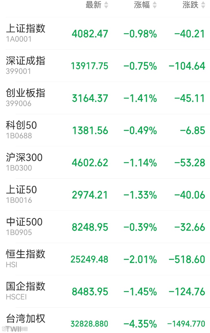 1、A股:A股缩量调整,上证指数收跌0.98%报4082.47点,深证成指跌0.75%,创业板指跌1.41%,万得全A跌0.69%。市场全天成交2.39万亿元,上日成交3.16万亿元。盘面上,中东局势持续动荡,市场炒作重心转移至粮食、化肥方向,石油天然气板块波动率上升,中国海油、中国石油、中国石化“三桶油”一度触及跌停,但随后反弹;港口航运、贵金属、燃气板块则集体回调。4万亿投资催生电网设备板块行情,多股涨停;军工装备板块同样逆势走高。