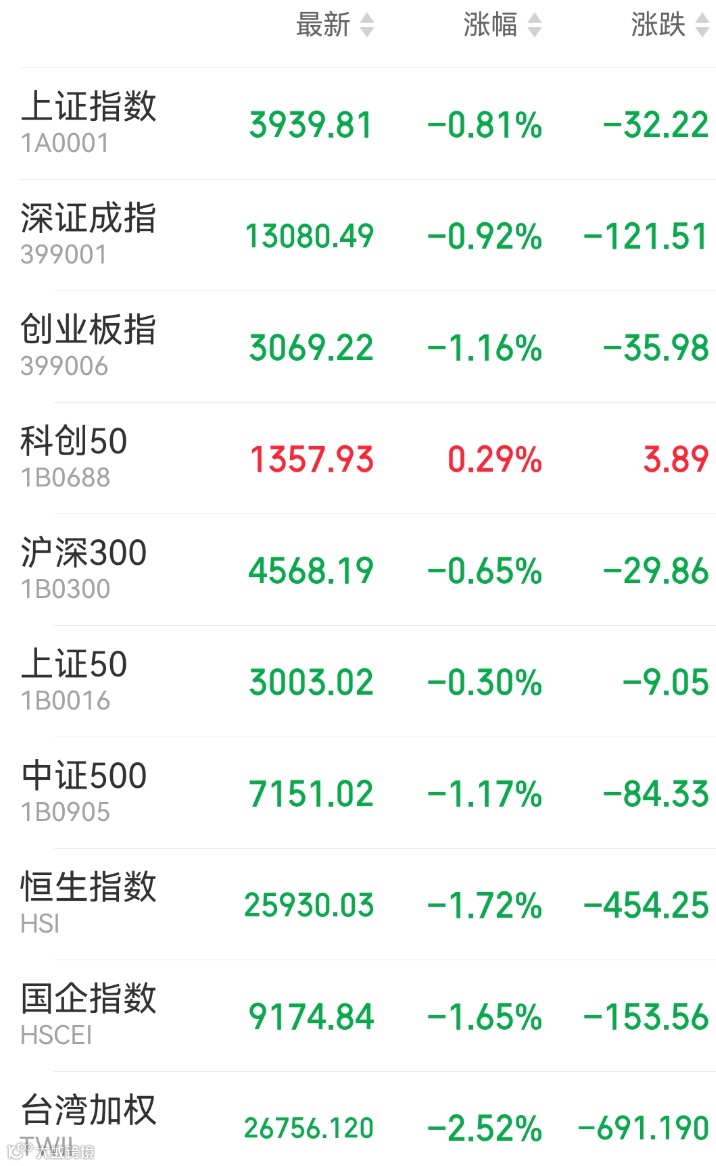 1、A股:A股震荡走低,市场逾4100股下跌,锂电池产业链全线回调,电解液、固态电池方向领跌;钢铁、化工、煤炭、有色金属行业跌幅靠前。AI应用题材持续活跃,互联网电商概念逆势走强。截至收盘,上证指数跌0.81%报3939.81点,深证成指跌0.92%,创业板指跌1.16%。A股全天成交1.95万亿元。