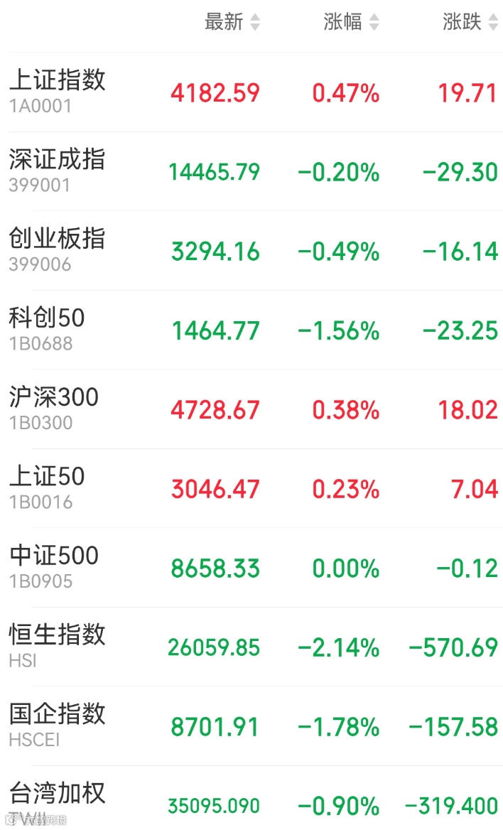 1、A股:周一上证指数收涨0.47%报4182.59点,深证成指跌0.2%,创业板指跌0.49%,万得全A跌0.4%。A股成交额突破3万亿, 创一个月新高。地缘政治紧张,避险情绪升温,石油天然气、贵金属、港口航运、军工、化工板块集体大涨,“三桶油”历史首次集体涨停。光纤概念股、液冷服务器、CPO概念股表现活跃;游戏、传媒、云计算等AI应用题材走弱,医药、消费股跌幅明显。
