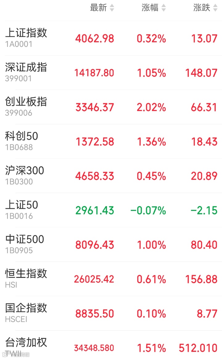 1、A股:A股探底回升,上证指数收涨0.32%报4062.98点,深证成指涨1.05%,创业板指涨2.02%,万得全A涨0.8%,市场成交额2.06万亿元。算力租赁、算电协同、算力硬件等AI算力产业链爆发;周期股普跌,化工、油气、锂矿、农业、房地产、煤炭板块表现不振。