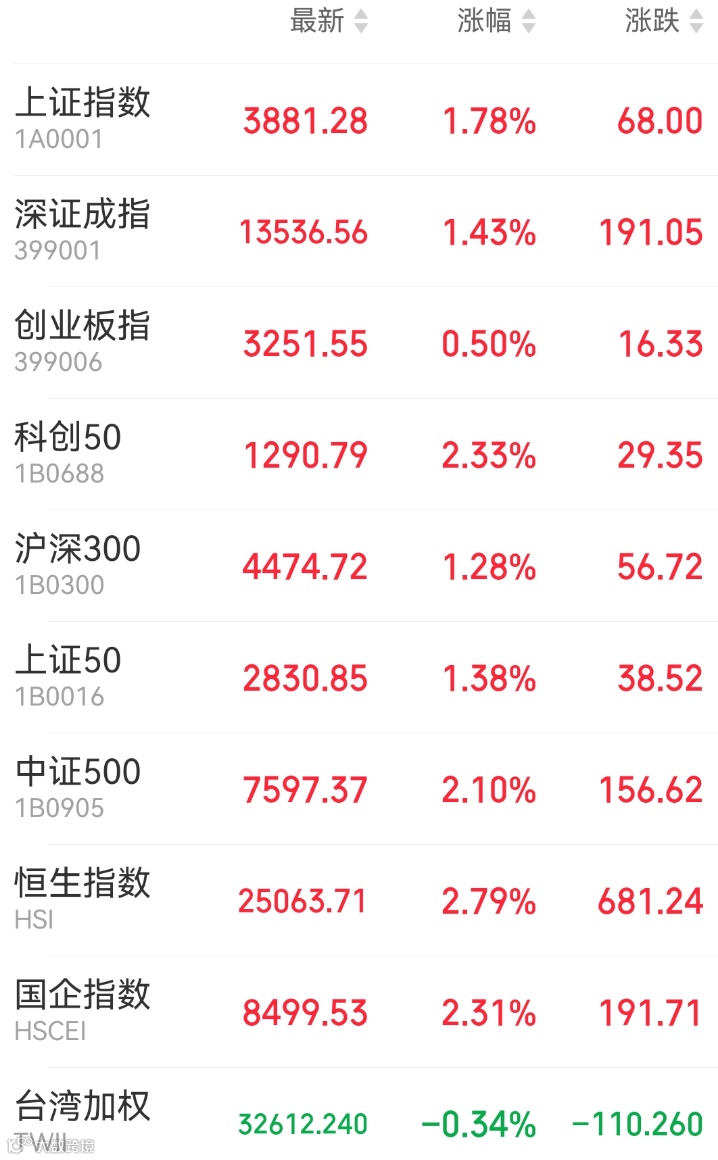 1、A股:A股强劲反弹,Wind概念指数全线飘红,市场逾5100股上涨。截至收盘,上证指数涨1.78%报3881.28点,深证成指涨1.43%,创业板指涨0.5%,万得全A涨2.11%,市场成交额2.1万亿元。军工股爆发,绿色电力、港口航运、减肥药、电网设备、锂矿概念涨幅居前;石油天然气板块回调。
