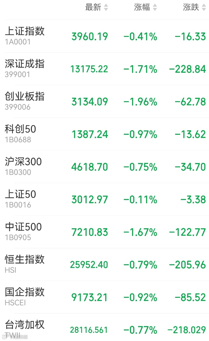1、A股:A股缩量调整,市场逾3600股下跌,锂电池、黄金、创新药、机器人、算力硬件、光伏、风电、消费电子概念股跌幅靠前,福建本地股大涨,银行股震荡攀升。上证指数收盘跌0.41%报3960.19点,深证成指跌1.71%,创业板指跌1.96%。A股全天成交1.94万亿元。