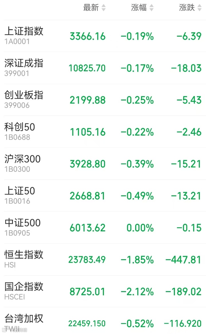 1、A股:A股三大指数震荡走弱,伴随量能萎缩,盘面热点相对匮乏。上证指数收盘跌0.19%报3366.16点,深证成指跌0.17%,创业板指跌0.25%,北证50涨1.89%,科创50跌0.22%,万得全A跌0.04%。市场成交额1.54万亿元。AI医疗概念股领涨,光伏产业链表现活跃,AI软硬件方向集体下挫。