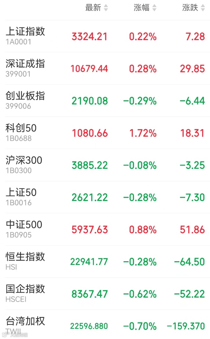 1、A股:A股三大指数涨跌不一,机器人题材卷土重来,军工股表现活跃,半导体产业午后发力;固态电池方向领跌,大消费板块调整。上证指数收涨0.22%报3324.21点,深证成指涨0.28%,创业板指跌0.29%,北证50涨3.24%,科创50涨1.72%,万得全A涨0.62%,万得A500跌0.09%,中证A500涨0.05%,市场成交1.48万亿元,逾4000股上涨。