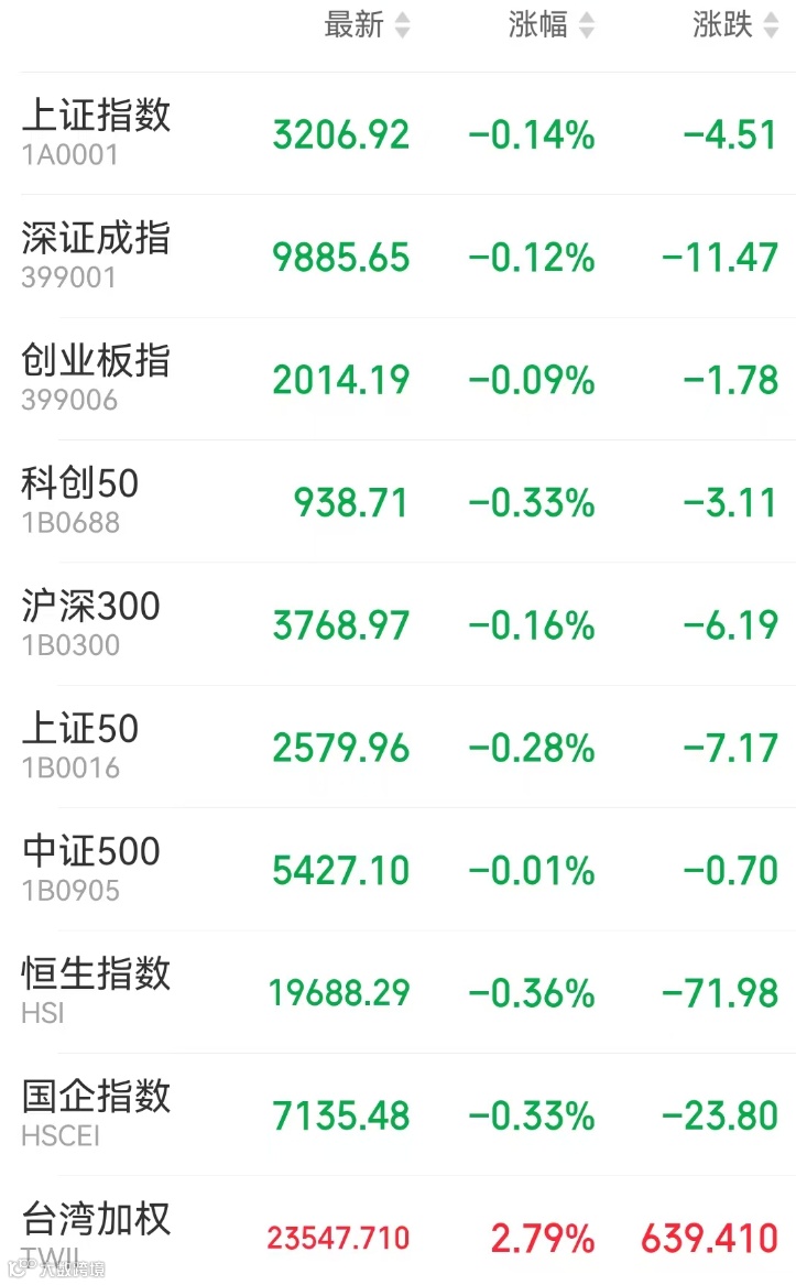 4、美股:美国三大股指收盘涨跌不一,道指跌0.06%报42706.56点,标普500指数涨0.55%报5975.38点,纳指涨1.24%报19864.98点。宝洁公司、霍尼韦尔国际跌超2%,领跌道指。万得美国科技七巨头指数涨1.9%,脸书涨超4%,英伟达涨逾3%。万得美股500(除七巨头)指数跌0.12%。中概股多数下跌,名创优品跌超12%,比特小鹿跌逾10%。