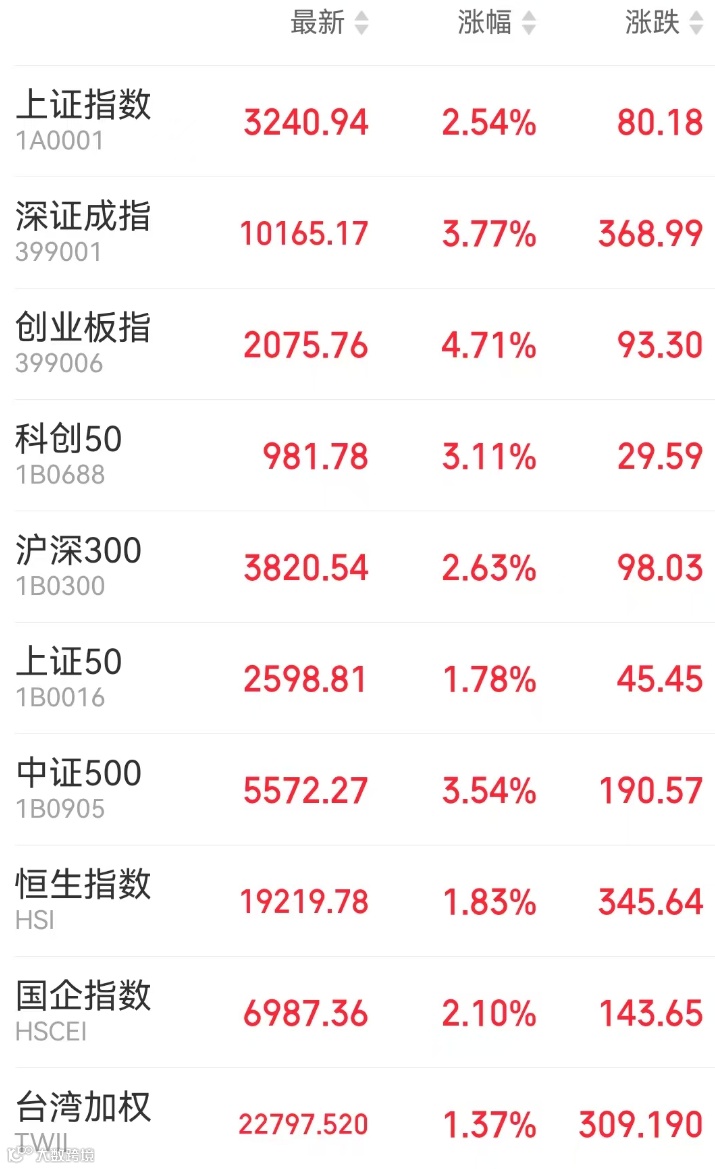1、A股:周二A股单边走强,三大指数均创2个月最佳表现,传媒、机器人、消费电子等题材集体大涨,小红书概念掀涨停潮。截止收盘,上证指数涨2.54%报3240.94点,深证成指涨3.77%,创业板指涨4.71%,北证50涨10.77%,科创50涨3.11%,万得全A涨3.59%。市场成交额扩大至1.37万亿元。