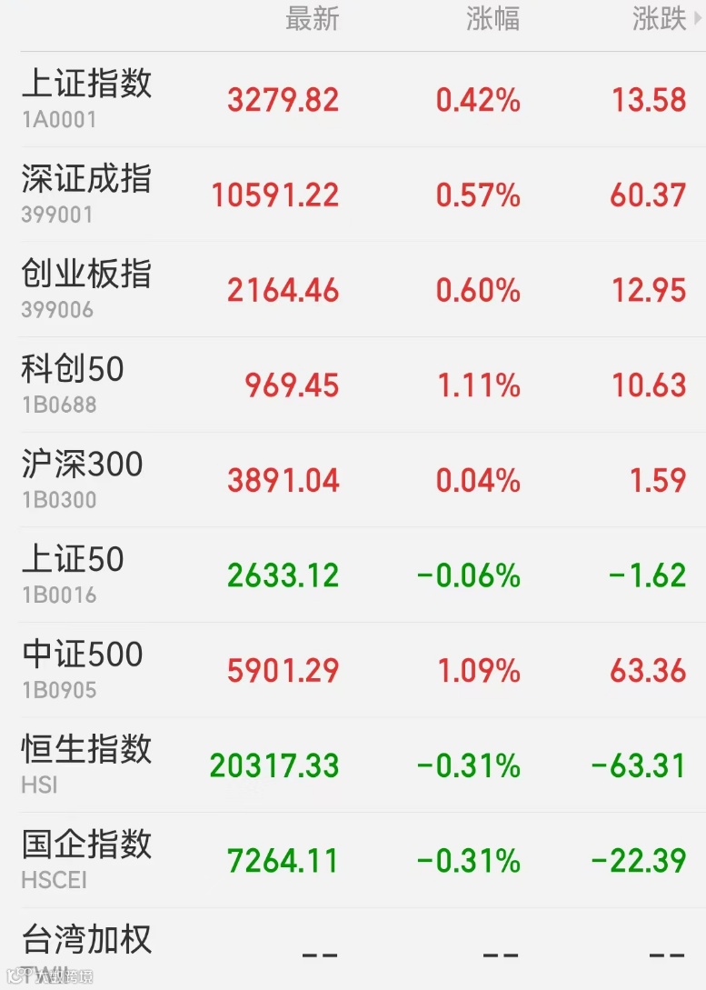 1、A股:A股三大指数小幅上扬,市场交投活跃。券商板块异动,哈投股份、第一创业、天风证券等涨停;半导体、光刻机概念大幅拉升,智谱AI概念热度不减,光伏、风电概念爆发;黄金、酒类股走势疲弱。值得注意的是,多只高位股尾盘“炸板”,海能达、华立股份、四川长虹等一度打开涨停,但随后快速回封。截至收盘,上证指数涨0.42%报3279.82点,深证成指涨0.57%,创业板指涨0.6%,北证50跌1.68%,科创50涨1.11%,万得全A涨0.81%,万得A500涨0.35%,中证A500涨0.23%。市场成交2.26万亿元。10月,上证指数累计跌1.7%,深证成指涨0.58%,创业板指跌0.49%;北证50涨43.8%,创历史最大单月涨幅。