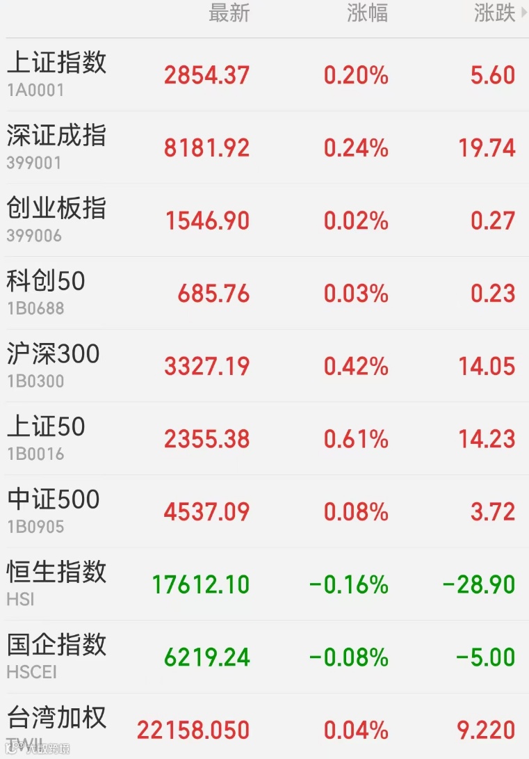 1、A股:A股震荡攀升,西部大基建概念午后崛起,华为鸿蒙题材全天强势。上证指数收涨0.2%报2854.37点,深证成指涨0.24%,创业板指涨0.02%,科创50指数涨0.03%,万得全A涨0.17%,万得A500涨0.38%。市场成交额5129.8亿元。上周,上证指数跌0.87%;深证成指跌2%,创业板指跌2.8%,均录得周线五连阴。
