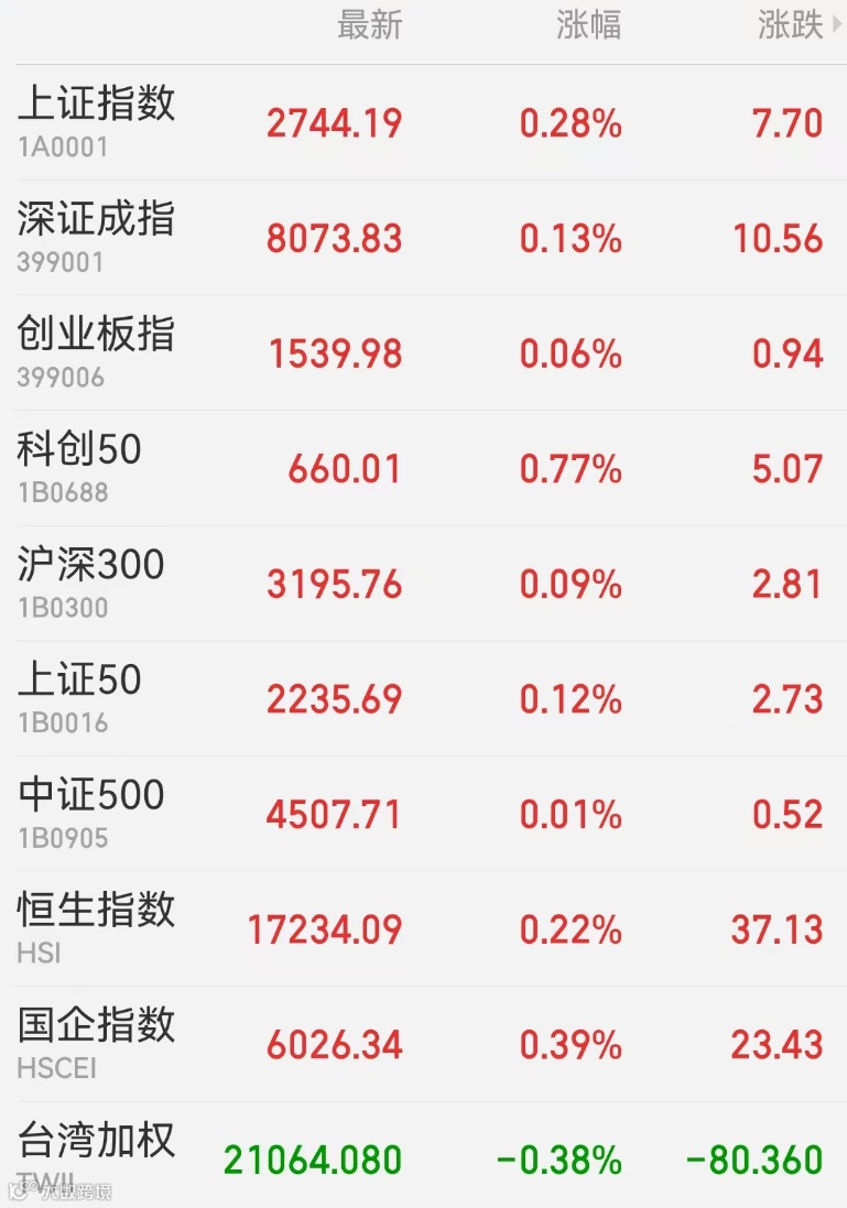1、A股:A股开启反弹,科技股引领反弹势头,消费电子及AI概念股携手共进。截至收盘,上证指数涨0.28%报2744.19点,深证成指涨0.13%,创业板指涨0.06%,万得全A涨0.2%,万得A500跌0.02%。市场全天成交额约5300亿元。全天超3300股飘红,短线情绪酝酿冰点后新生。