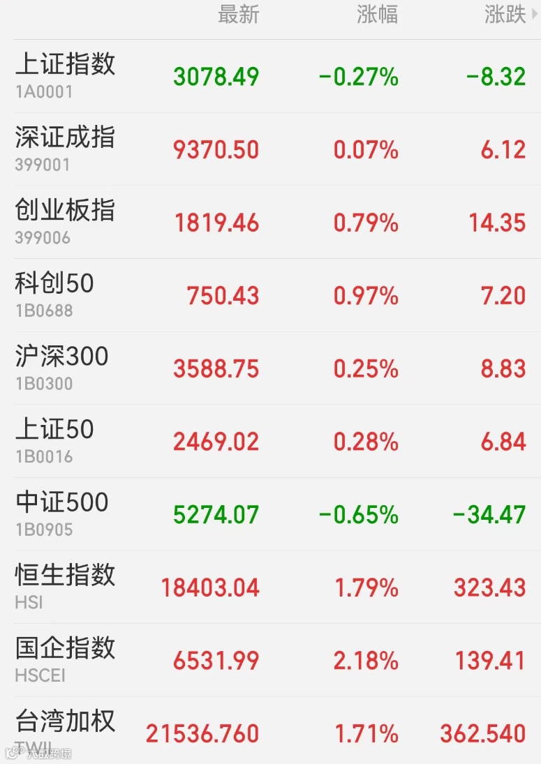 2、港股:港股三大指数大幅收高,恒生指数涨1.79%报18403.04点,恒生科技指数涨2.53%,恒生国企指数涨2.18%。科技、工业、汽车板块涨幅居前,消费股回暖,医药、贵金属走弱。大市成交1323.1亿港元,南向资金净买入34亿港元,中国移动获大幅净买入17.94亿港元。中国台湾加权指数涨1.71%。