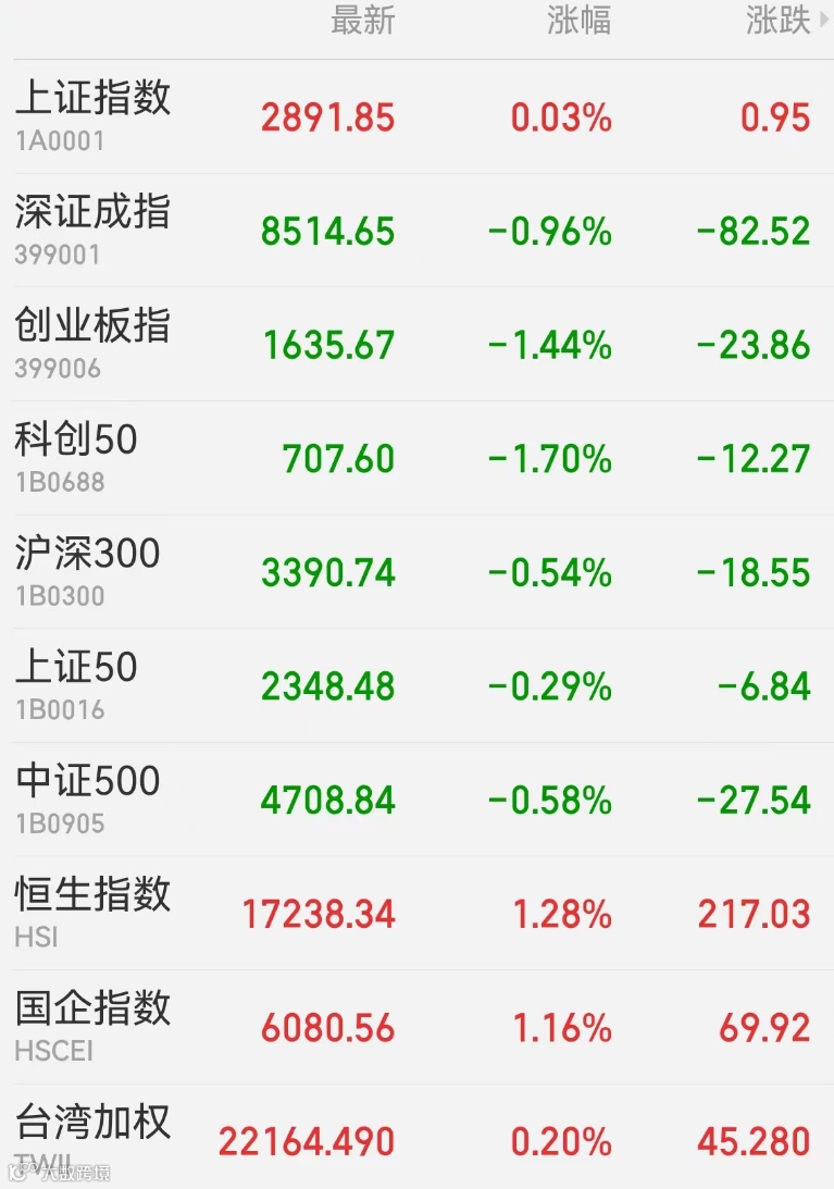 1、A股:A股全天分化演绎,双创指数受权重影响跌幅较大,高速铜连接、低空经济概念双双反抽,新能源、大消费则持续失血,资金开始极致抱团高标股。截至收盘,上证指数微涨0.03%报2891.85点,上证收益指数首秀收涨0.04%,深证成指跌0.96%,创业板指跌1.44%,万得全A跌0.33%,万得A500跌0.58%。市场成交额约5900亿元,北向资金净卖出49.85亿元,贵州茅台、宁德时代分别遭净卖出5.72亿元、2.57亿元。