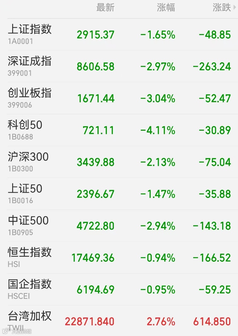 1、A股:A股全天无抵抗式下跌,场内近4700股下跌,ST板块尾盘跳水。银行股继续演绎负贝塔角色,工农中交四大行续创历史新高。截至收盘,上证指数跌1.65%报2915.37点,深证成指跌2.97%,创业板指跌3.04%,万得全A跌231%,万得A500跌2.41%,科创50跌逾4%。市场成交额近6700亿元。北向资金净卖出41.83亿元。