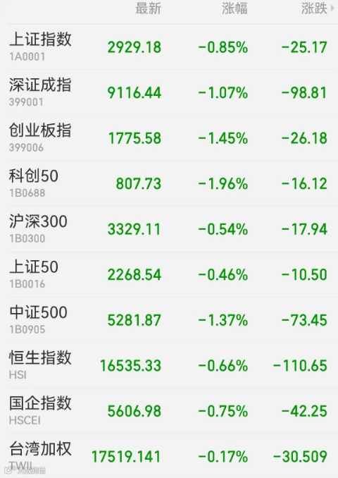 1、A股:A股持续低迷,银行板块逆势上涨,新旧能源“一哥”大战,中国神华市值超过宁德时代。截至收盘,上证指数跌0.85%,报2929.18点,周跌1.54%;深证成指跌1.07%,周跌4.29%;创业板指跌1.45%,周跌6.12%,创2022年9月以来最差单周表现;北证50跌4.02%,周跌3.05%;科创50跌1.96%,周跌5.20%;上证50跌0.46%,周跌2.48%;深证50跌0.61%,周跌4.68%;万得全A跌1.21%,周跌2.97%;万得双创跌1.98%,周跌5.33%;万得微盘股指数跌1.55%,周涨0.01%。A股成交额为7548.2亿元,北向资金净买入19.92亿元,格力电器获净买入4.06亿元居首,五粮液遭净卖出2.12亿元最多。