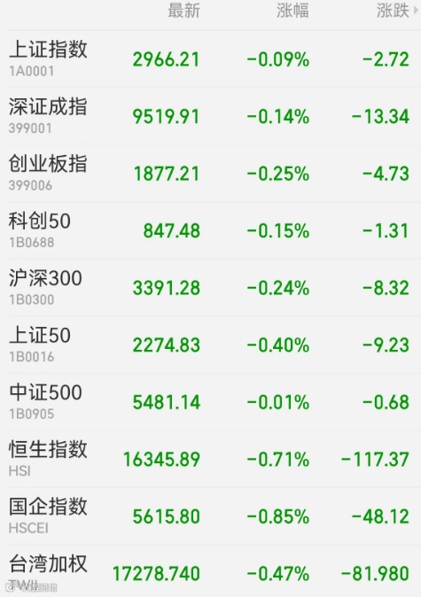 2、港股:香港恒生指数收跌0.71%报16345.89点,恒生科技指数跌0.73%,恒生国企指数跌0.85%。油气、工业、原材料板块跌幅居前,信义光能跌近5%领跌蓝筹,中国海油跌近3%。网络医疗股回暖,药师帮大涨18%,平安好医生涨超3%。大市成交890.37亿港元,南向资金净卖出16.35亿港元,盈富基金遭净卖出20.02亿港元居首,美团-W逆势获净买入6.3亿港元。中国台湾加权指数收盘跌0.47%报17278.74点。