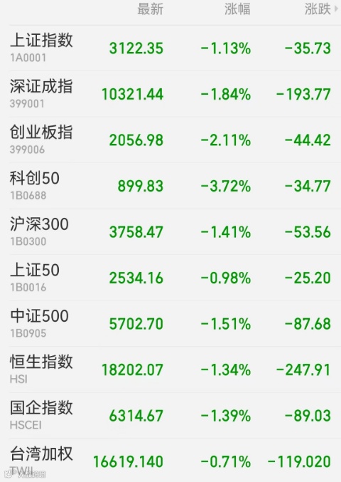 1、A股:A股大幅走弱,半导体板块大跌。上证指数收跌1.13%,报3122.35点,深证成指跌1.84%,创业板指跌2.11%,科创50跌3.72%,上证50跌0.98%,北证50跌1.89%,万得全A跌1.55%,万得双创跌2.25%。A股成交额为7683.7亿元,北向资金净卖出70.72亿元,贵州茅台遭净卖出4.69亿元居首,宁德时代获净买入3.98亿元最多。