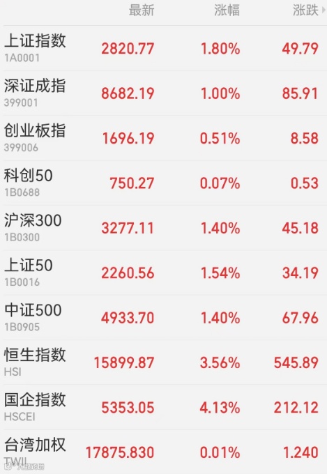 2、港股:香港恒生指数收涨3.56%,报15899.87点,恒生科技指数涨4.24%,恒生国企指数涨4.13%。“中字头”表现强势;科技股领涨,阿里巴巴涨逾7%。个股方面,中国重汽涨逾21%。大市成交1288.07亿港元,南向资金净买入19.81亿港元,盈富基金获净买入10.35亿港元居首,腾讯控股遭净卖出6.75亿港元最多。中国台湾加权指数收涨0.01%,报17875.83点。