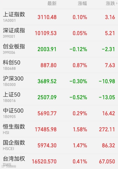 2、港股:港股收盘全线上涨,恒生指数涨1.58%报17485.98点,周跌1.82%;恒生科技指数涨1.55%,周跌2.66%;恒生国企指数涨1.47%,周跌2.83%;大市成交479.88亿港元。平台经济、大金融、医药生物板块普涨,内房股走势分化,人工智能概念股表现活跃。中国台湾加权指数收盘涨0.41%,报16520.57点,上周累计上涨1.02%。